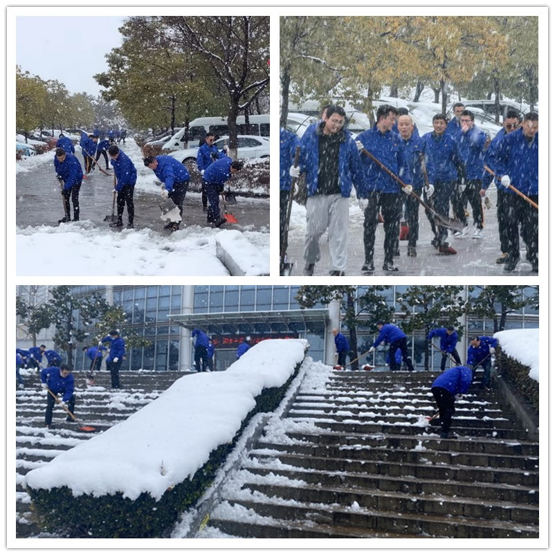 在尹总、赵总监、邓主席的带领下,参与扫雪的同志们,不畏严寒,顶着风雪,积极投身到扫雪“战斗”中,大家挥舞着铁锹、雪铲和扫帚对公司交通主干道、大门口、坡道、台阶、停车场等处的积雪进行清扫。大家齐心协力,配合默契,有的铲,有的推,有的扫,快速将积雪铲起集中堆放,把厂区内道路和台阶上的积雪逐渐清理干净。尽管同志们的手和脸被冻的通红,衣服、裤子、鞋子也被雨雪浸湿,然而这一切丝毫没有影响大家的热情和清扫效率,手中的扫雪工具不停地挥舞。